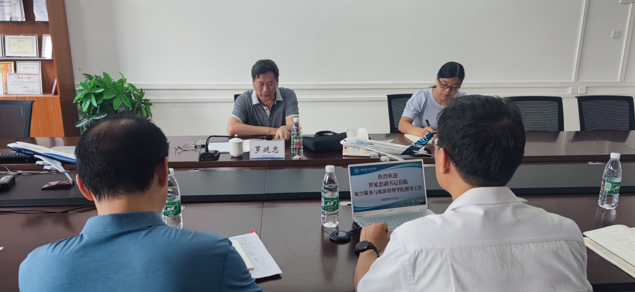 罗延忠听取了学院领导班子本学期初新冠疫情防控、教学安排、学生工作、招生就业、专业评估等工作汇报,了解了学院在期初的工作部署和实施情况,认为学院期初各项工作有条不紊,同时对存在的问题也指出了解决思路与方法。他强调:一要坚持问题导向,突出重点工作,加快补短板强弱项;二要扎实推进教学品牌建设,结合学院航空旅游类专业群发展规划,发挥专业优势特色,培育一流课程、一流专业;三要把握学生关切需要,抓好学生学业帮扶、心理咨询、考研就业、学科竞赛等专项工作,切实解决学生“急难愁盼”的实际问题;四要深化校企合作,开展访企拓岗促就业系列活动,推动学生创业就业与产教融合发展。
