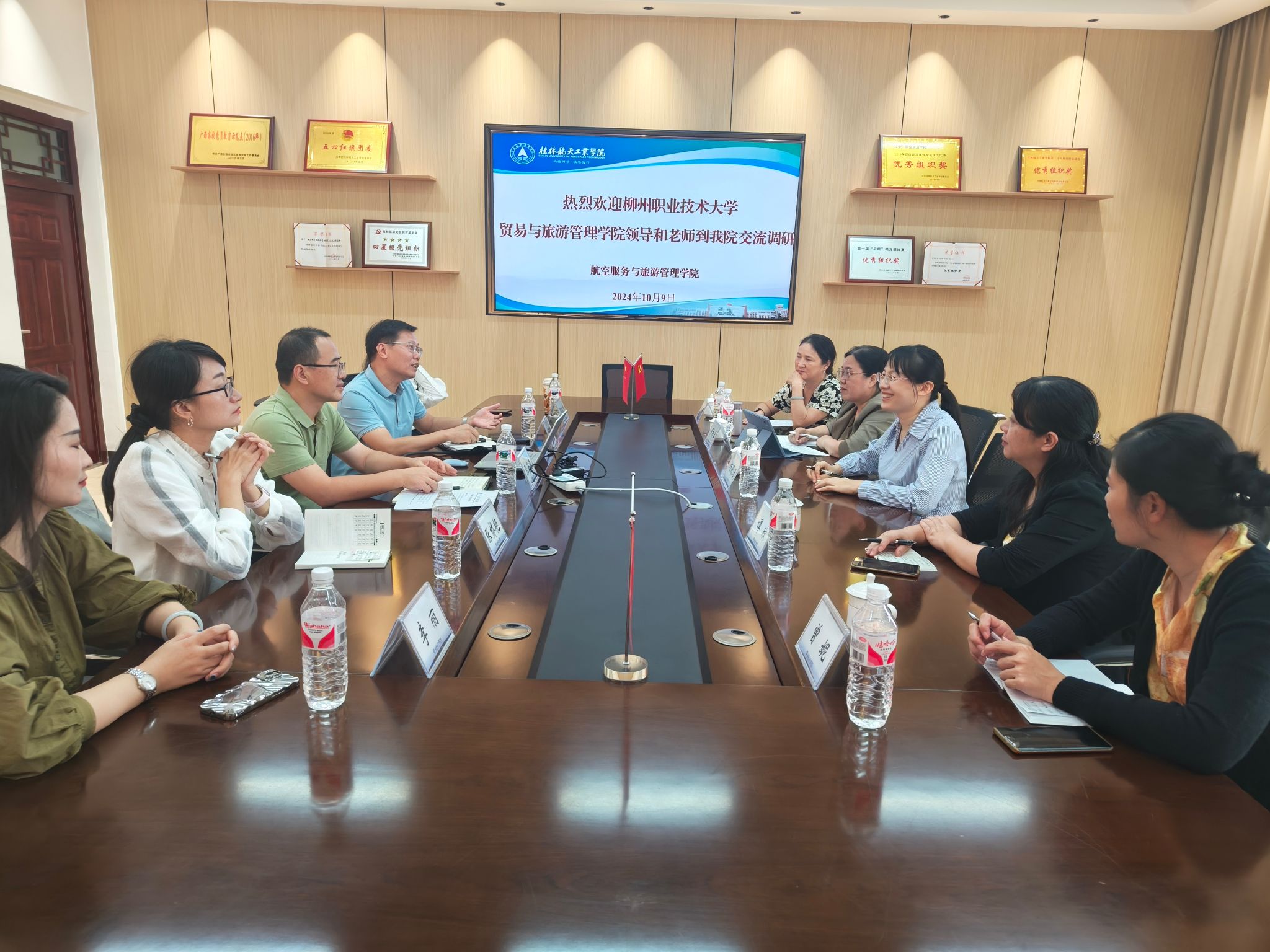 林朝阳代表学院对同行的到访表示热烈的欢迎,并向到访嘉宾简单介绍了学院的发展历程、师资队伍、专业发展、人才培养以及社会服务等方面的情况。杨歌谣对我院的热情接待表示了由衷地感谢,并对学院的办学理念、教学条件和办学成果给予了充分肯定,尤其对学院“服务地方经济,促进航旅深入融合”的理念表达了高度赞赏。她也简要介绍了柳州职业技术大学贸易与旅游管理学院概况以及专业建设情况。