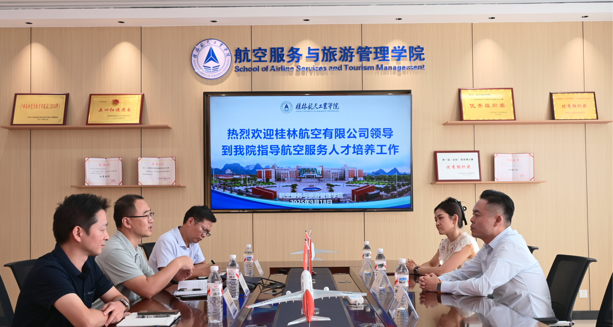 为进一步优化航空服务人才培养方案,提升学生的实践能力和就业竞争力,9月18日下午,桂林航空有限公司运营副总裁李林、客舱部总经理许曦文一行来院指导航空服务人才培养工作。学院党委书记张海涛、院长林朝阳、党委副书记张磊磊在探天楼C208会议室与来宾进行了深入交流,双方就航空服务人才的培养模式、课程设置以及实习实训等方面展开了详细探讨。