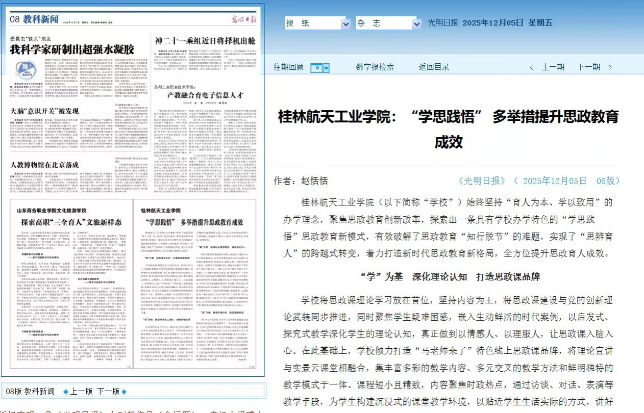 作为广西唯一航空航天人才培养院校,学校相关育人经验获主流媒体关注,彰显了学校在人才培养领域的探索成效与行业影响力。
