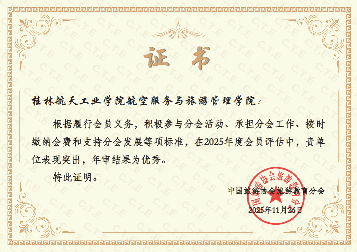 近日,中国旅游协会旅游教育分会启动会员单位年审程序,分会秘书处对会员单位进行了2025年年度评估,全面梳理、统计了各会员单位全年参与活动情况,根据履行会员义务、积极参与分会活动、承担分会工作、按时缴纳会费和支持分会发展等项标准进行综合评定。我院凭借优质的教育质量、丰硕的科研成果以及积极的履职表现,在中国旅游协会旅游教育分会年审中被评定为优秀等次。
