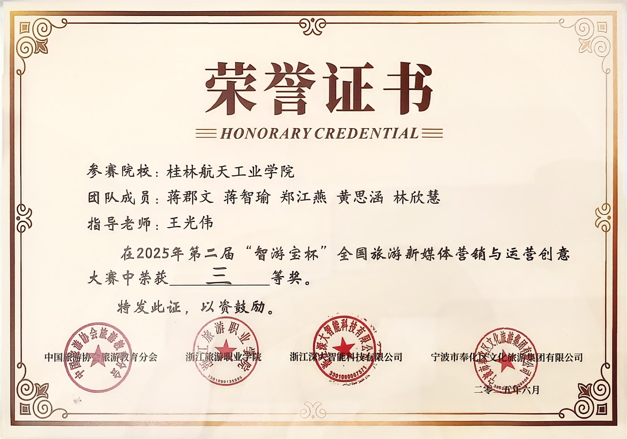 2025年6月7日,2025年第二届“智游宝杯”全国旅游新媒体营销与运营创意大赛在宁波奉化落下帷幕。本次大赛自启动以来,便受到全国百余所院校的积极响应,600多支队伍、4000多名师生踊跃参与。大赛历经初赛、实践活动和决赛三个阶段,共推出5000余个宣传视频,开展300多场直播,提交600余份营销运营方案。我院酒店管理专业蒋郡文、蒋智瑜、郑江燕、黄思涵、林欣慧组成的队伍代表学校参赛,凭借优异的现场表现荣获决赛三等奖。
