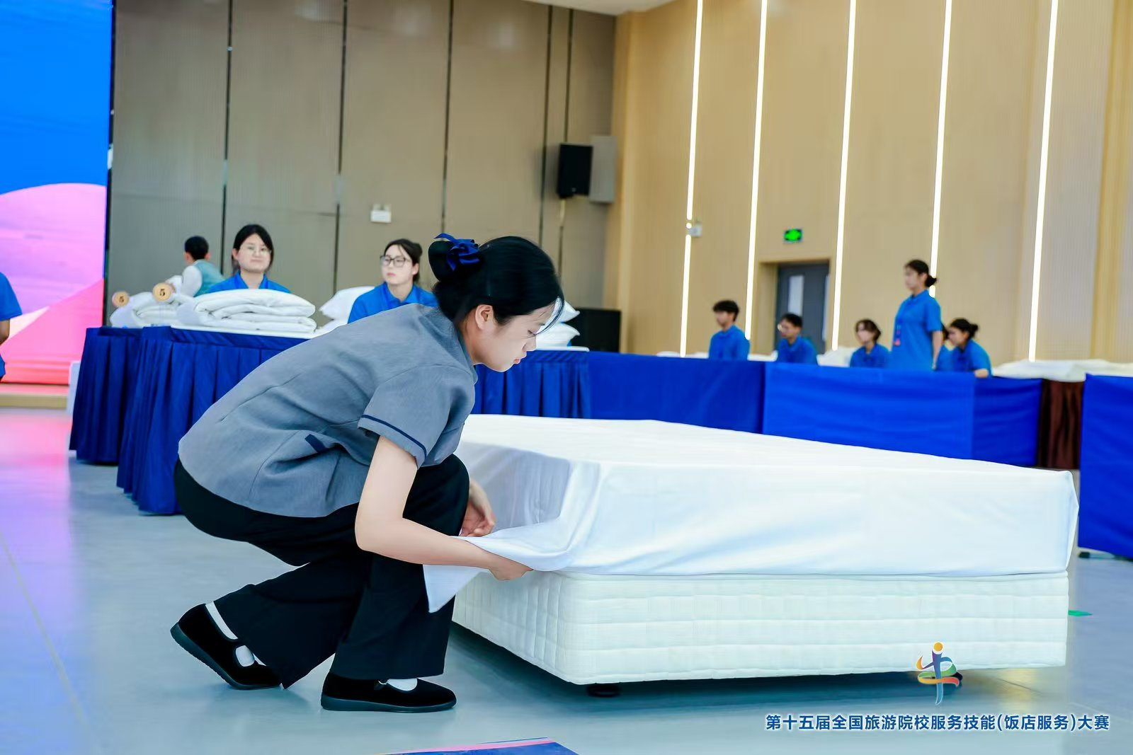 本届大赛以“赛技能、促教学、育人才”为核心目标,覆盖本科院校组、高职高专院校组和中职学校组三大组别,设置中餐宴会摆台、西餐宴会摆台、客房服务、鸡尾酒调制四大核心项目。比赛内容涵盖综合知识理论考核、英语水平测试及现场操作三大环节,全面检验选手的专业知识、实操能力与跨文化沟通素养。