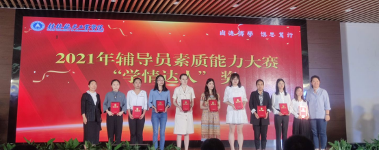 比赛邀请到了来自广西师范大学、桂林理工大学、桂林医学院、桂林旅游学院、桂林师范高等专科学校的学工部门领导进行现场评比。经过激烈角逐,陈丹、赵红艳获辅导员能力素质大赛三等奖。