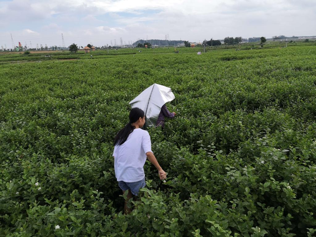 在走访了村委会后,我们来到茉莉花花田旁。未近茉莉花,却闻到了茉莉花的阵阵甜美清香,虽然烈日当空,不少叶片上都还沾有些许的露水,在阳光下隐隐闪光。沿着水泥路一路向下,看到了很多花农忙碌在一道道茉莉花树旁,他们采摘花苞放入自己身前的小袋子里。我下去向一位花农咨询,他回答这些花苞是为制作茉莉花茶采摘的,并且只能采摘花苞,开放的暂时都不要。他还说每次雨后,茉莉花就会开放,所以每天都要来采摘,一天会来10多个小时,早晨6点就会来到茉莉花田采摘,到傍晚7时左右。因为晚上8点后,茉莉花苞会陆陆续续的开花。茉莉花花期比较长,他说从今年五月开始采摘,到十月才结束。而盛开的茉莉花在十月份后才会被需要采摘。花苞目前结得多的话,可以采摘20-30斤左右,如果少,则以个位数为收获。