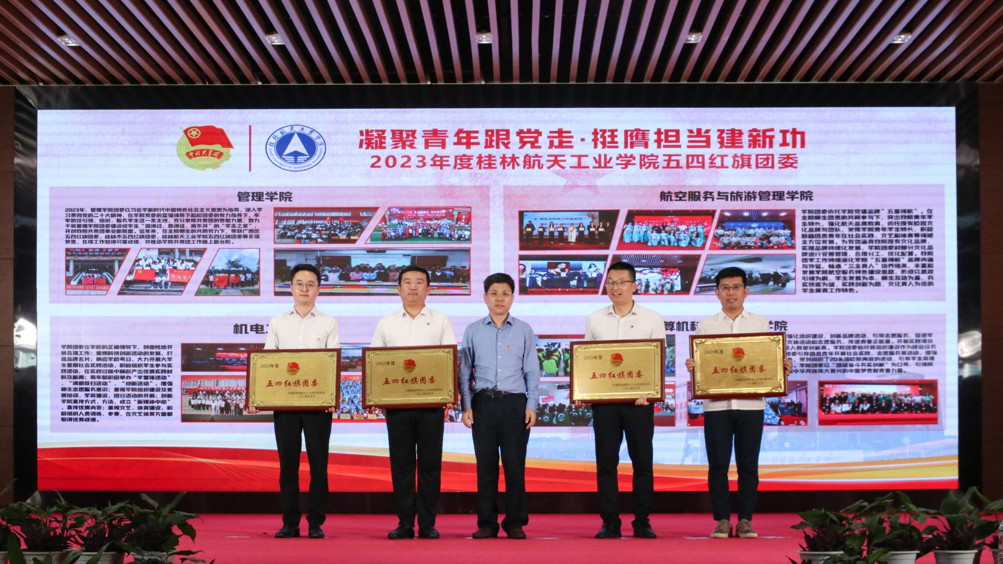 活动现场校团委主要负责人宣读了《关于表彰2023年度共青团组织先进集体和先进个人的决定》,韩峻峰、吴江萍及各部门负责人为获奖单位和个人颁奖。在本次团日活动中,我院荣获2023年度“五四红旗团委”称号;2022级酒店管理1班团支部荣获2023年度“五四红旗团支部标兵”称号;谢柳红同学荣获2023年度“共青团优秀团员标兵”称号;闫清源同学荣获2023年度“共青团优秀团干标兵”称号。