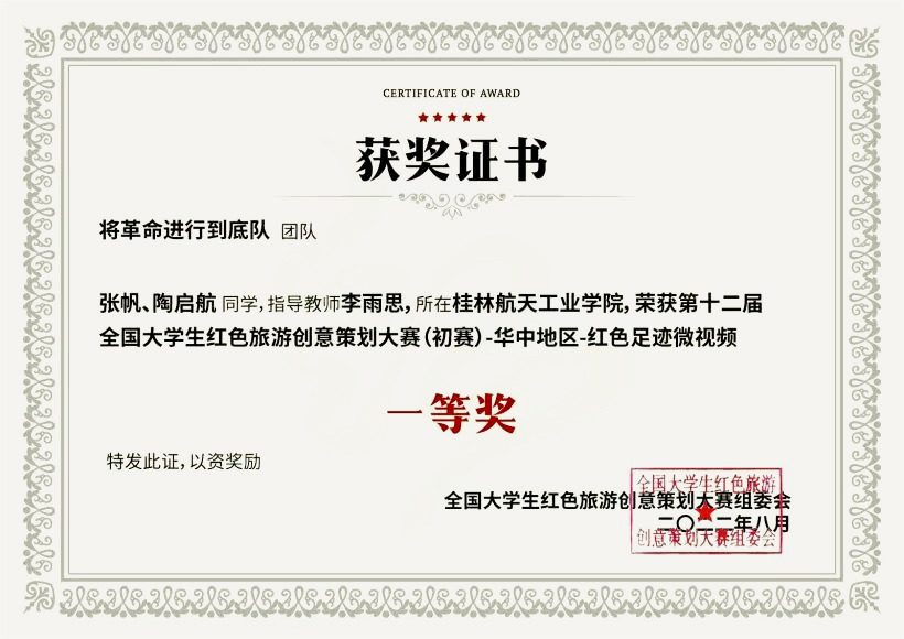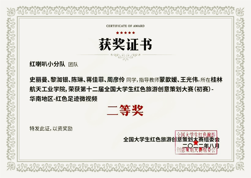 近日,第十二届全国大学生红色旅游创意策划大赛在北京落下帷幕,我院教师党员指导的学生团队踊跃参赛,历时4个月的角逐,从全国943所高校、7085支队伍、3.8万名师生中脱颖而出,在“红色足迹微视频”类别中“将革命进行到底”团队获得华中区一等奖,“红喇叭小分队”、“火苗小队”团队分别获得华南区二等奖。