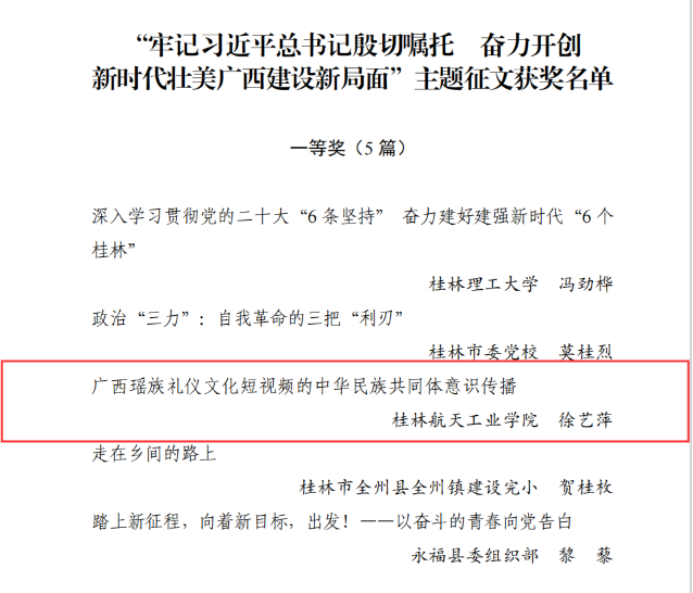 近日,桂林市党的建设研究会公布了“牢记习近平总书记殷切嘱托 奋力开创新时代壮美广西建设新局面”主题征文比赛获奖名单,我校共选送八篇文章,我院徐艺萍老师文章《广西瑶族礼仪文化短视频的中华民族共同体意识传播》荣获一等奖,陈丹老师文章《八桂大地心向党 踔厉笃行新征程》荣获三等奖。