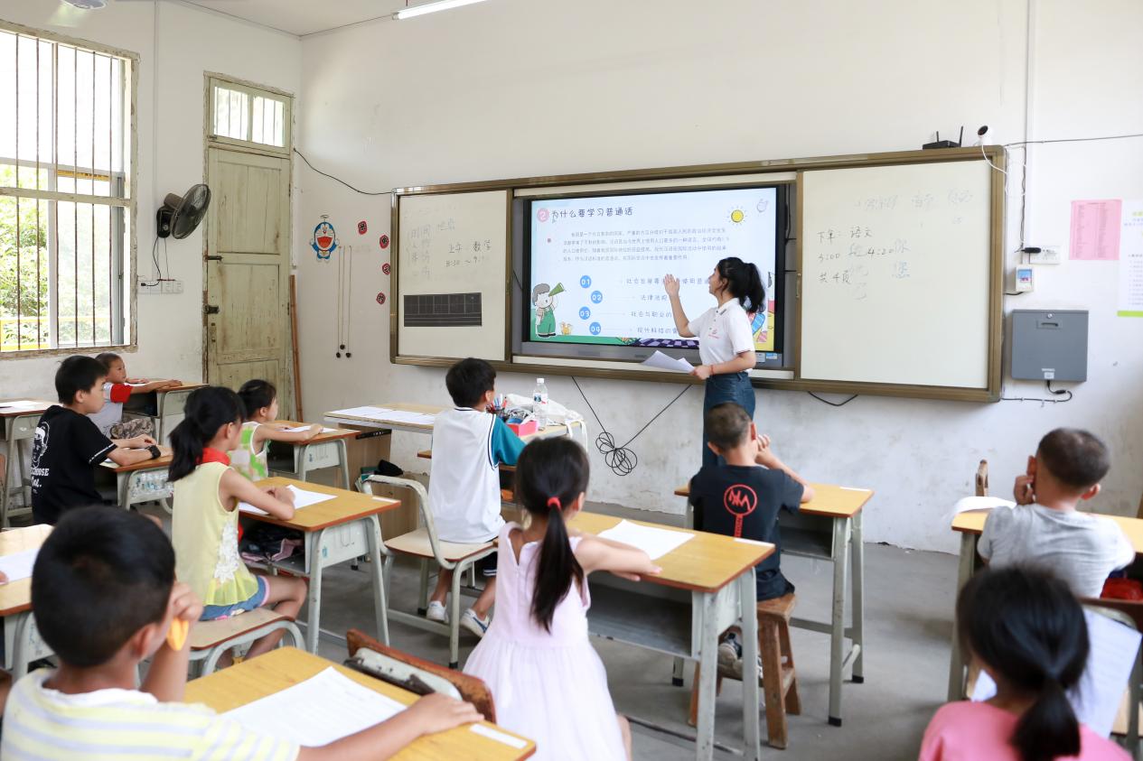 图为实践团成员为共耕村小学学生进行趣味普通话授课