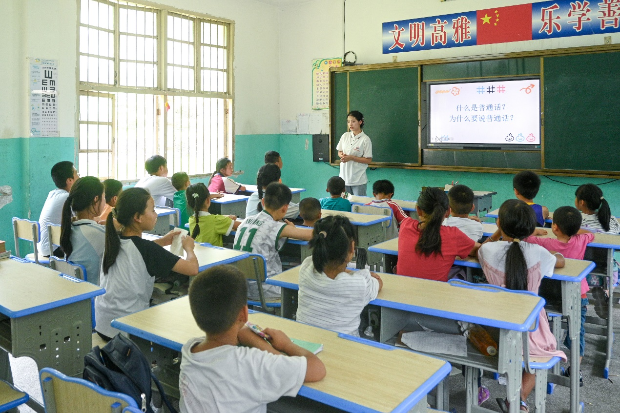 学院“赴灌阳推普助力乡村振兴”大学生暑假社会实践志愿服务活动团队在桂林市灌阳县新圩镇解放村进行普通话推广活动。团队以趣味推普课程为起点,深入基层走访调查,全面调研边远民族地区普通话普及应用情况。