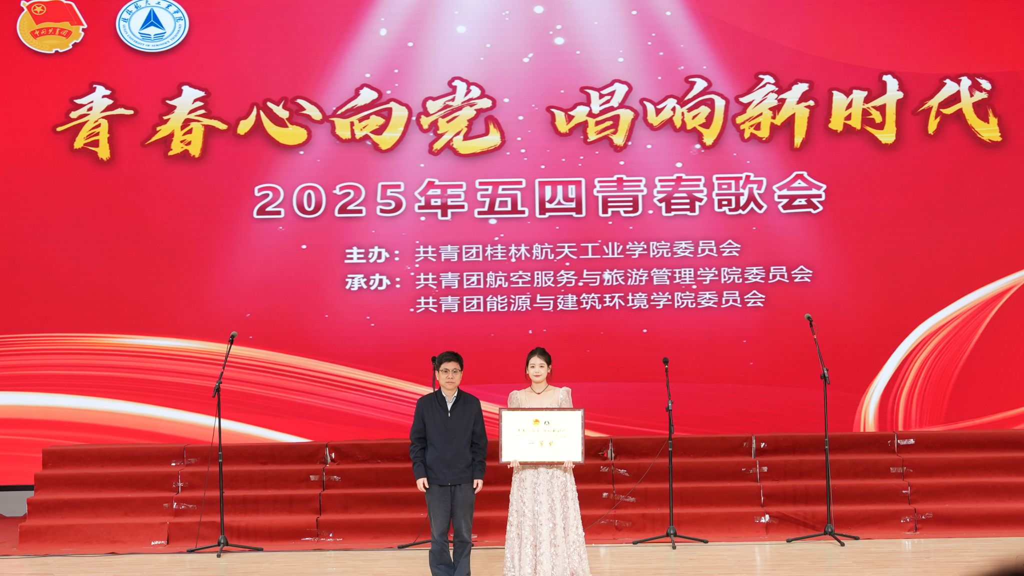 2025年4月27日晚,我校“青春心向党 唱响新时代”五四青春歌会在南校问天楼报告厅圆满落幕。伟德bv1946官网青年学生代表团凭借合唱作品《初光》的精彩演绎,以96.64分的全场最高分勇夺比赛一等奖,充分展现了我院学子的艺术素养与团队凝聚力,校党委书记韩峻峰出席活动并为学院团队颁发一等奖奖牌。