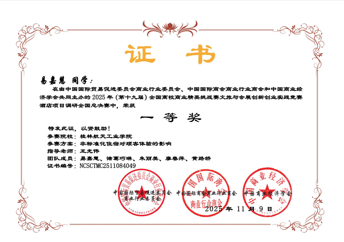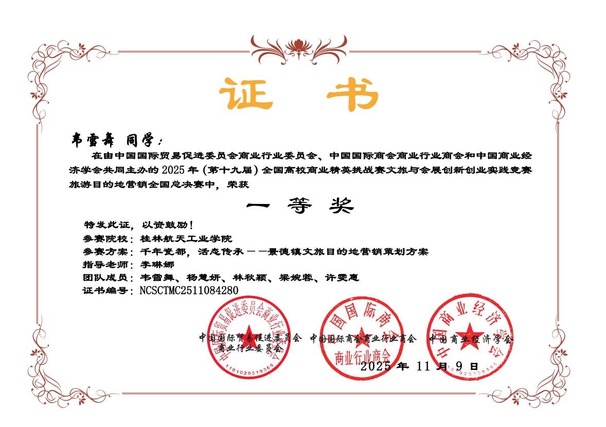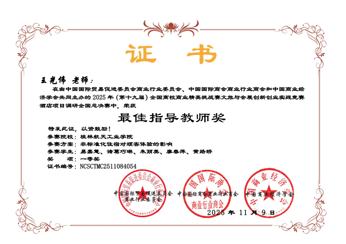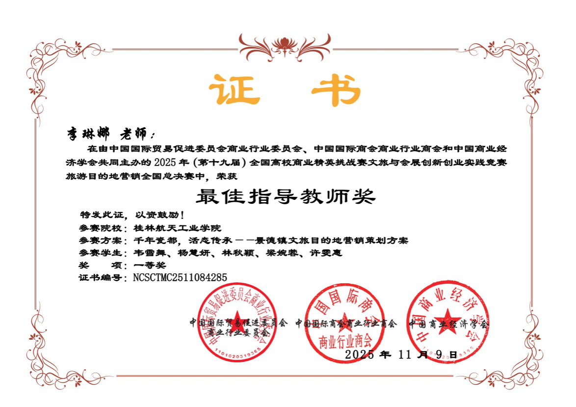 近日,由中国国际贸易促进委员会商业行业委员会、中国国际商会商业行业商会和中国商业经济学会联合主办的2026年(新加坡)国际商务会展策划大赛中国地区选拔赛暨第十九届全国高校商业精英挑战赛文旅与会展创新创业实践竞赛全国总决赛成功举办。经过“知识赛-广西区赛-全国总决赛”的层层选拔与角逐,我院酒店管理、旅游管理与服务教育、播音与主持艺术等专业学生共获得一等奖2项、二等奖3项、三等奖10项的好成绩,王光伟、蒙歆媛、李琳娜等教师获得最佳指导教师称号,桂林航天工业学院获得全国总决赛最佳院校组织奖。