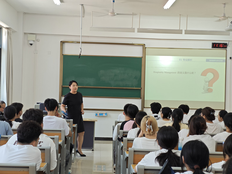 酒店管理教研室王光伟、张艳梅、李琳娜等老师为学生们详细解读了酒店管理专业的课程体系和职业发展路径。王光伟老师首先介绍了酒店行业的现状与未来趋势,强调了酒店管理专业在现代服务业中的重要地位。张艳梅老师鼓励学生们积极参与各类实践活动,通过实习和实践课程,积累宝贵的工作经验,提高自己的职业竞争力。李琳娜老师分享了在酒店行业多年的工作经验,为新生们提供了许多实用的建议,她特别强调了沟通技巧和服务意识在酒店管理中的重要性,并通过生动的案例分析,帮助学生们更好地理解理论知识与实际工作的结合。