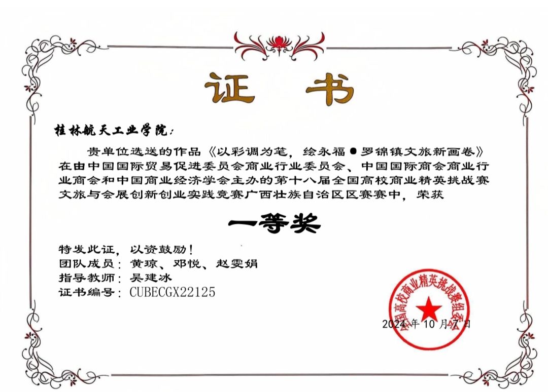 我院酒店管理、旅游管理与服务教育、旅游管理、播音与主持艺术等专业学生积极参赛,共推荐16支队伍70余名学生参加区赛,经过激烈角逐,最终获得三等奖以上奖项14项(一等奖5项,二等奖6项,三等奖3项),其中一等奖、二等奖作品共11项推荐参加全国总决赛。桂林航天工业学院获得全国高校商业精英挑战赛文旅与会展创新创业实践竞赛(广西区赛)优秀组织奖。
