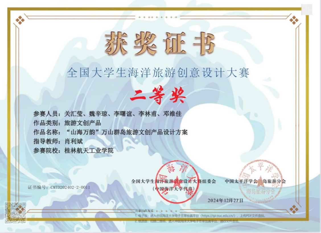 我院酒店管理等专业学生积极参与,共有三支队伍进入决赛,其中作品“空中研学,守护蔚蓝”(负责人:戴静芸,指导教师:蒙歆媛)“山海万韵万山群岛旅游文创产品设计方案”(负责人:关汇莹,指导教师:肖利斌)获得二等奖,“探秘南海瑰宝——西沙群岛奇幻之旅”(负责人:潘洪耀,指导教师:王光伟)获得三等奖。